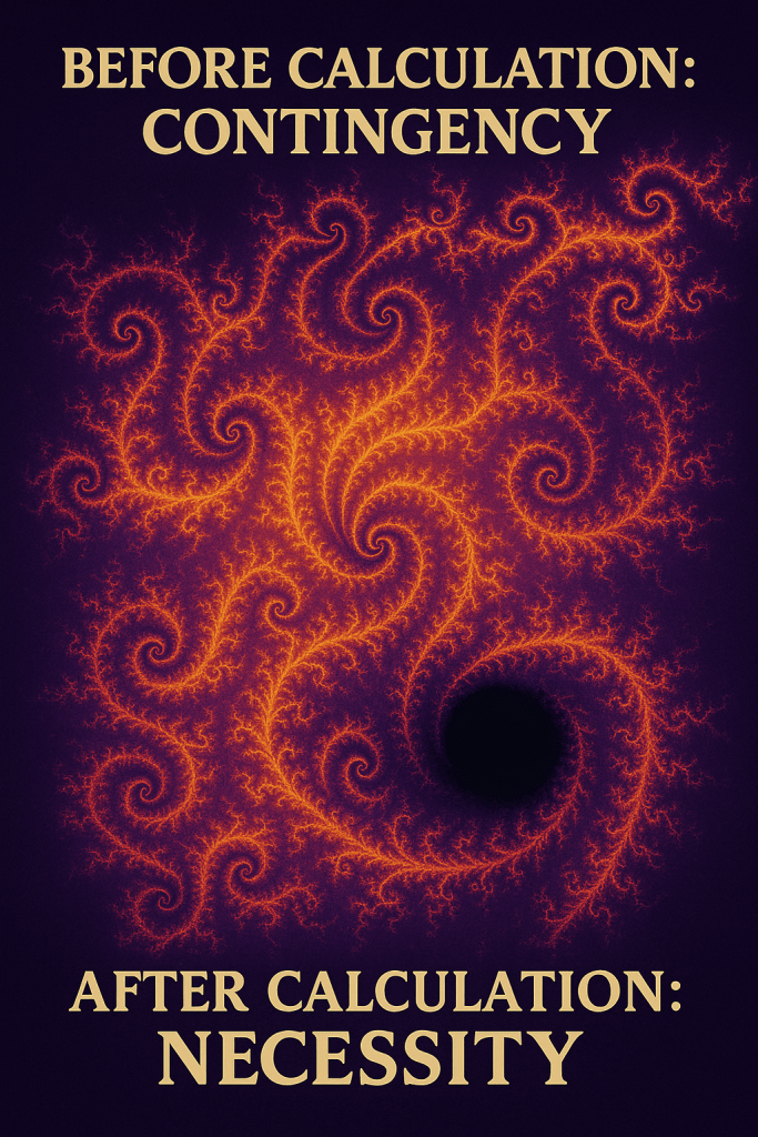 What we call “evolution” is necessity unfolding temporally. What we call “laws of physics” are descriptions of necessary relations. What we call “choice” is determination flowing through deliberative processes. What we call “existence” is mathematical consistency realized.